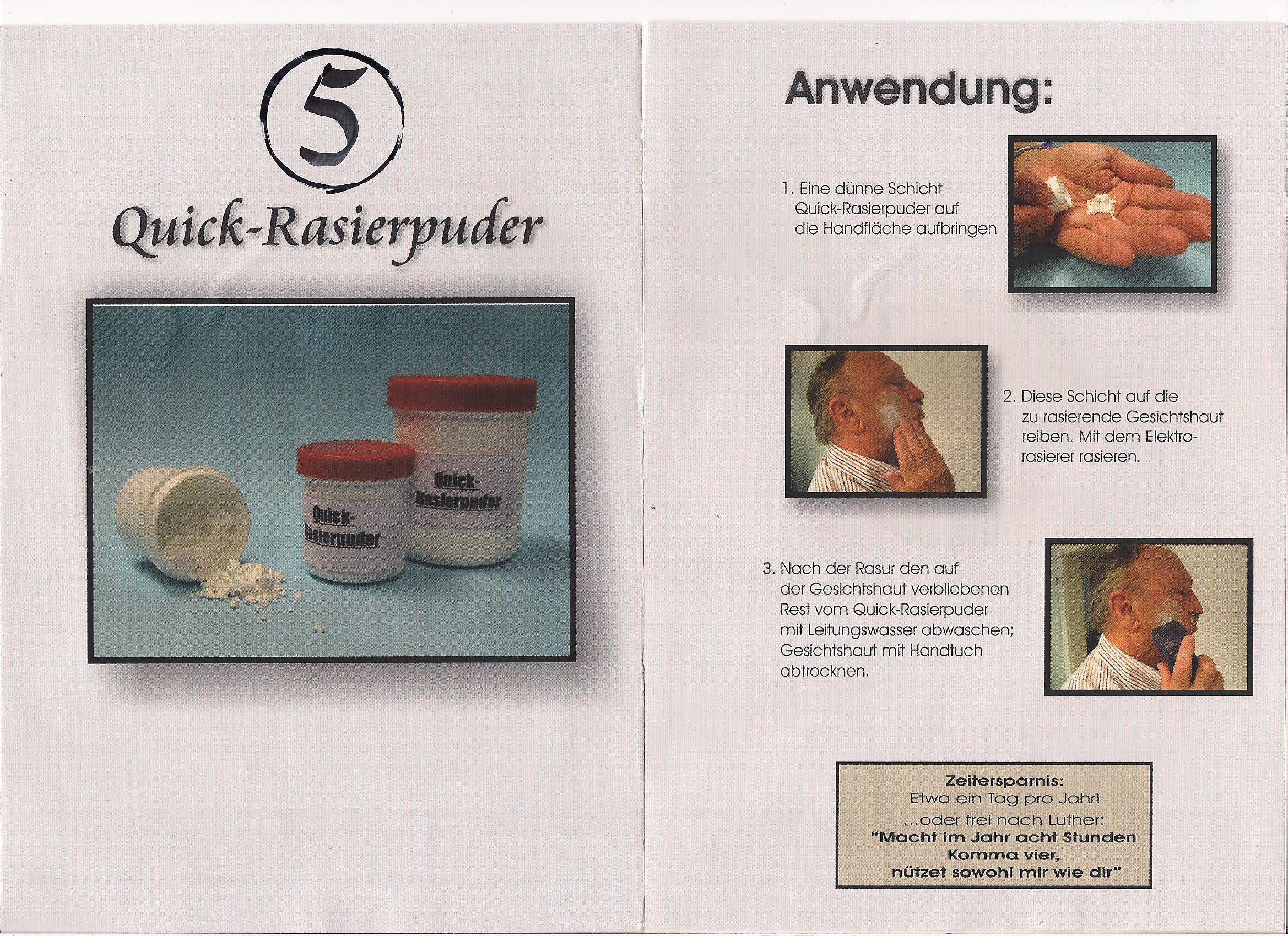 Erfinder; Walter Busch E-Mail: Erfindung: Gleitpuder für Elektro-Rasur Beschreibung: Gleitpuder für Elektro-Rasur: Puder wird dünn auf die Haut getragen; besonders wohltuend für empfindliche Haut Bild (zum Vergrößern anklicken)